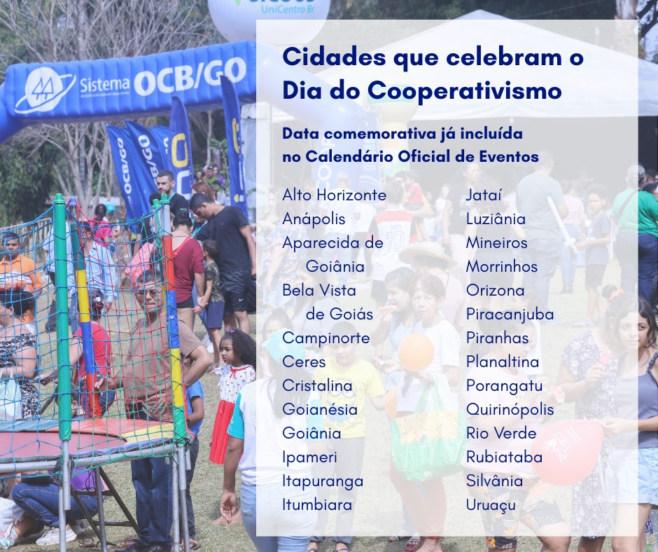 Para que haja a inclusão da data comemorativa no Calendário Oficial de Eventos dos municípios, o Sistema OCB/GO atua inicialmente com a sensibilização do poder público. Vencida esta etapa, o processo segue com a apresentação de Projeto de Lei pela Prefeitura ou Câmara de Vereadores, com proposta de data (dia ou semana); aprovação e sanção da Lei, culminando com a realização da festa em parceria com cooperativas locais e a Prefeitura Municipal.