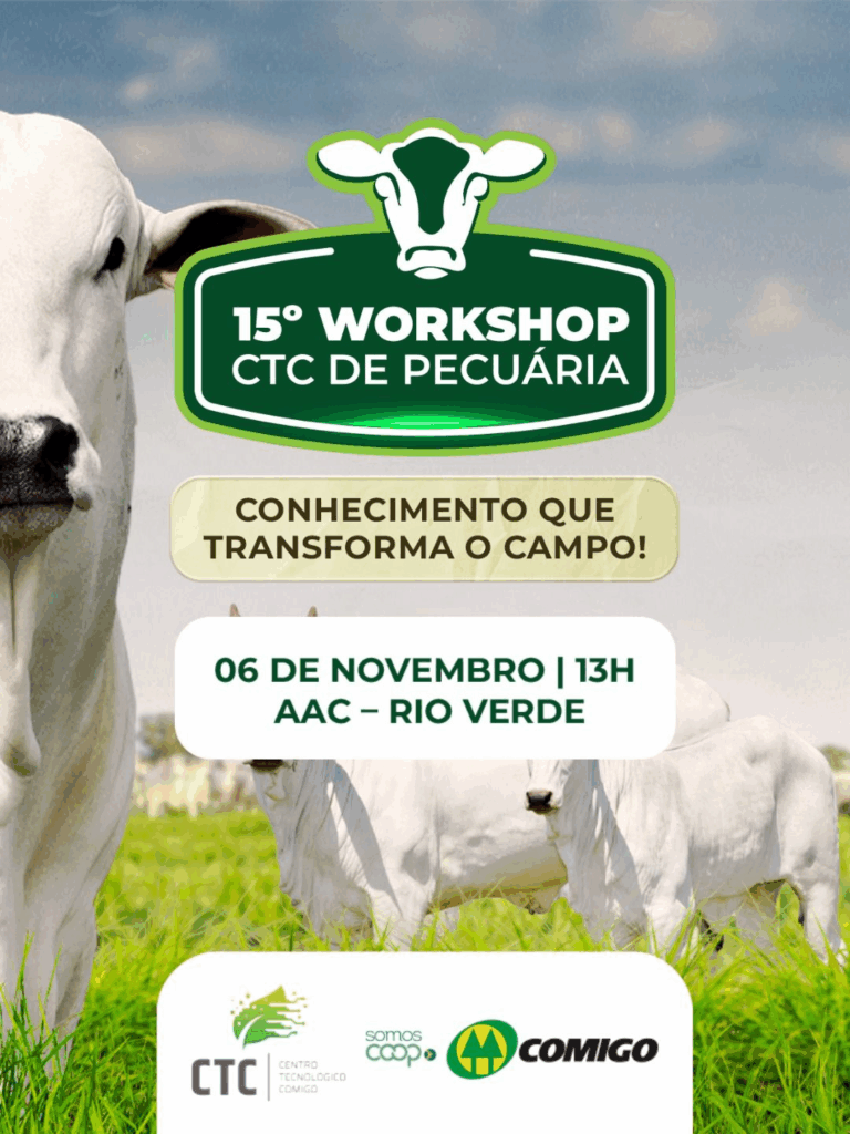 A Comigo promove, no dia 6 de novembro, a 15ª edição do Workshop CTC de Pecuária. O evento será realizado a partir das 13 horas, na Associação Atlética COMIGO (AAC), em Rio Verde, e reunirá produtores, técnicos e profissionais do setor pecuário em uma tarde de atualização e troca de conhecimento.