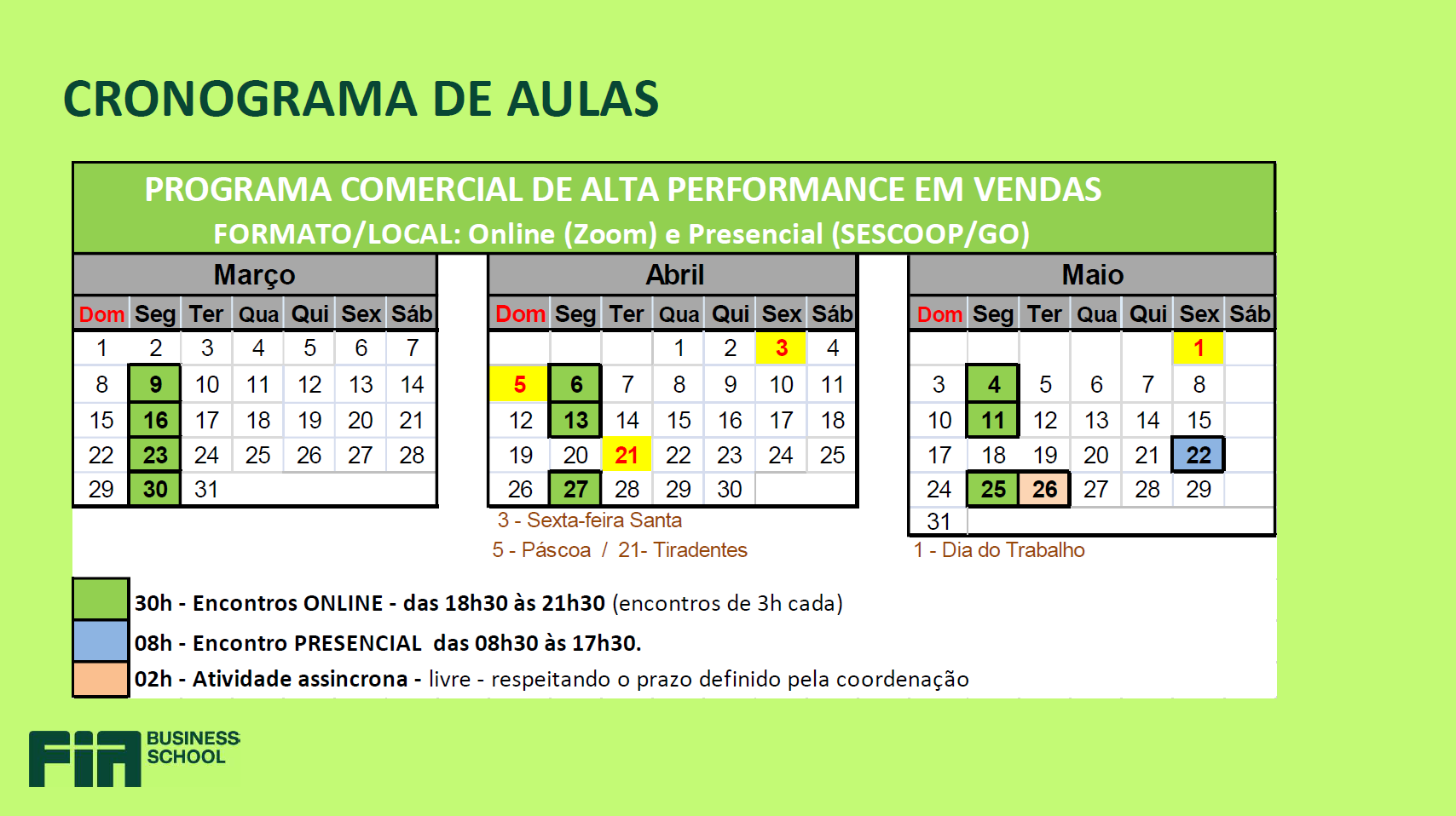 Local: Os encontros virtuais serão realizados por meio de ferramentas de videoconferência (zoom) em sessões de interação com os professores, os encontros presenciais serão realizados na Sede do SESCOOP/GO em Goiânia/GO.