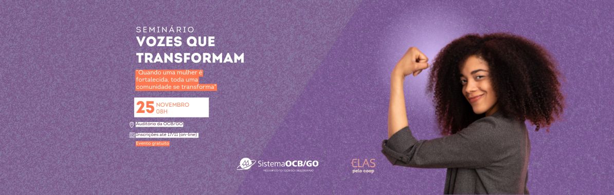 O Sistema OCB/GO, em parceria com o Comitê de Mulheres Elas pelo Coop GO, realiza o Seminário “Vozes que Transformam”, em alusão ao Dia Internacional pela Eliminação da Violência contra a Mulher. Será um momento de reflexão, aprendizado e fortalecimento do papel feminino na sociedade.