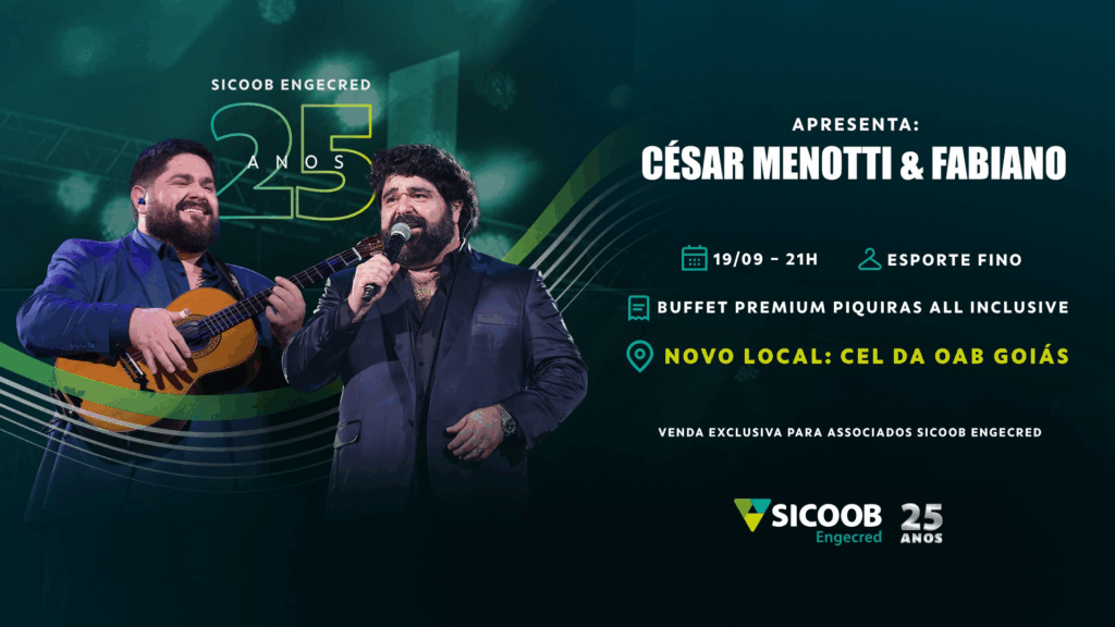 Para marcar a celebração do aniversário de 25 anos, o Sicoob Engecred realizará uma grande festa, no dia 19 de setembro, a partir das 21 horas, no CEL da OAB Goiás. Os ingressos são limitados e estão disponíveis no site da Bilheteria Digital. Cada associado pode adquirir até duas unidades por CPF/CNPJ.